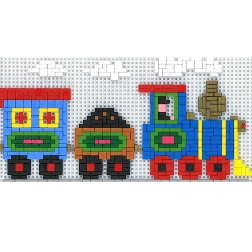 ontstaat de afbeelding. Het grote voordeel echter ten opzichte van een legpuzzels is, dat de steentjes en grondplaat steeds opnieuw voor nieuwe