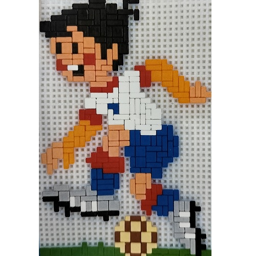 aan de onderzijde pinnetjes die in deze gaatjes passen. Door de verschillende kleuren steentjes volgens het patroon in de gaatjes te prikken