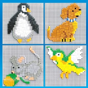 aan de onderzijde pinnetjes die in deze gaatjes passen. Door de verschillende kleuren steentjes volgens het patroon in de gaatjes te prikken