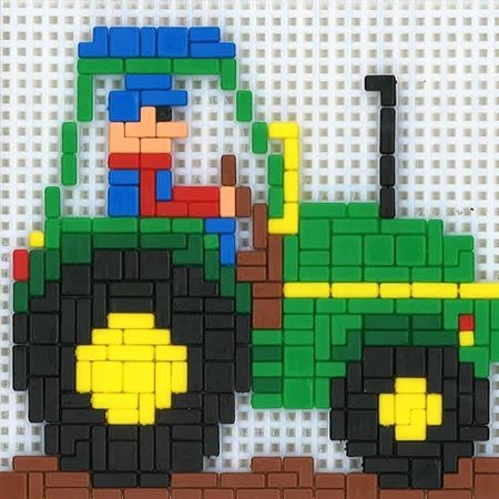 aan de onderzijde pinnetjes die in deze gaatjes passen. Door de verschillende kleuren steentjes volgens het patroon in de gaatjes te prikken